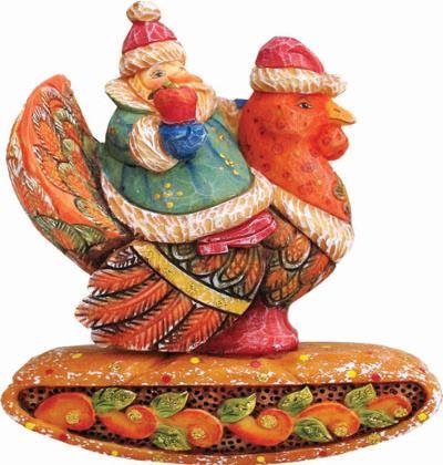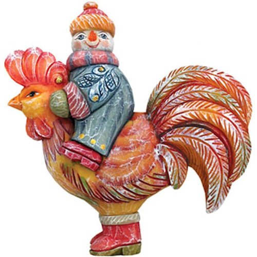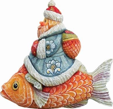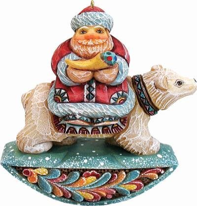 The Traveling Santas is a collection of ornaments featuring Santa riding on different birds and animals. They are beautiful, whimsical renditions of Santa as we don’t ever think of him. Do you ever think of Santa as riding on an owl or a fish? The attention to detail in these ornaments, as in all the G. DeBrekht ornaments, is magnificent. This is beautiful Russian style folk art.
